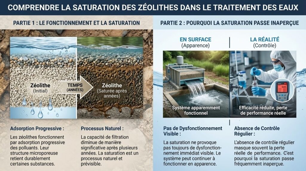 Les zéolithes fonctionnent par adsorption progressive des polluants présents dans les eaux usées. En effet, leur structure microporeuse retient durablement certaines substances jusqu’à atteindre une limite physique. Ainsi, après plusieurs années, la capacité de filtration diminue de manière significative. Par conséquent, la saturation constitue un processus naturel et prévisible dans le temps.