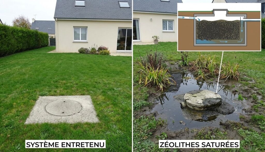 Lorsque les zéolithes sont saturées, la filtration devient moins performante et plus irrégulière. En effet, les polluants traversent plus facilement le média filtrant sans être correctement retenus. Ainsi, la qualité du traitement global de la fosse septique se dégrade progressivement. En comparaison, un système entretenu conserve une performance plus stable dans le temps.